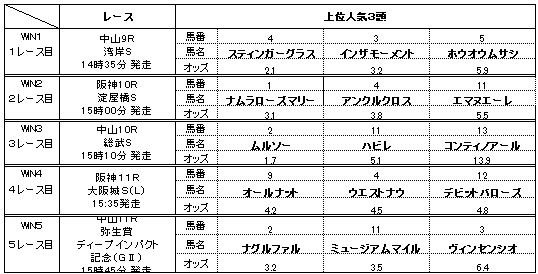 それでは、前日オッズを確認しておきましょう。なお、中山開催分はJRAのオッズ情報がないので、推定値を入れていますので、ご了承願います。