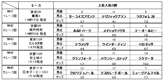 圧倒的な人気になっているレースは、京都10レースです。注意したいのは、京都は10レースになっている点です。まあ、毎年そうなので大丈夫だとは思いますが、念のため記載しておきます。どうしてもダービーウィークですから、主力騎手不在で、もしかしたらは考えておきたいですね。どのようなレースになってもおかしくないかもしれません。ただ、それ以外のレースは拮抗していると言ってもよさそうです。ダービーは少し抜けているかもしれません。皐月賞馬の評価が思った以上に低い感じもしますね。強い勝ち方だったのですが。