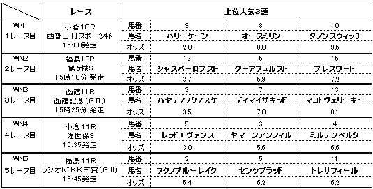 圧倒的な人気になっているレースは、なさそうですが、小倉10レースは少し抜けている状態です。逃げられますし、小倉開催ですから期待感は高くなります。それ以外は拮抗していると言えそうですが、函館記念は少し抜けているでしょうか。ただ、これまでと開催時期が異なるだけに、参加メンバーが微妙な状況です。雨が降っている時期も多いのですが、良馬場開催の方が力勝負になってきそうで楽しみです。