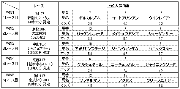 圧倒的な人気になっているレースは、なさそうです。さすがに京成杯は難しいオッズ構成になっています。馬場が悪ければ、今後につながるレースになってくるのですが、今年はそうでもなさそうですね。少し抜けた状況は、日経新春杯になります。4歳馬が人気になっています。菊花賞後の一戦になりますから、距離的にこちらの方が力が出せる状況ともいえそう。横山典騎手がどのように騎乗してくるのかも楽しみです。
